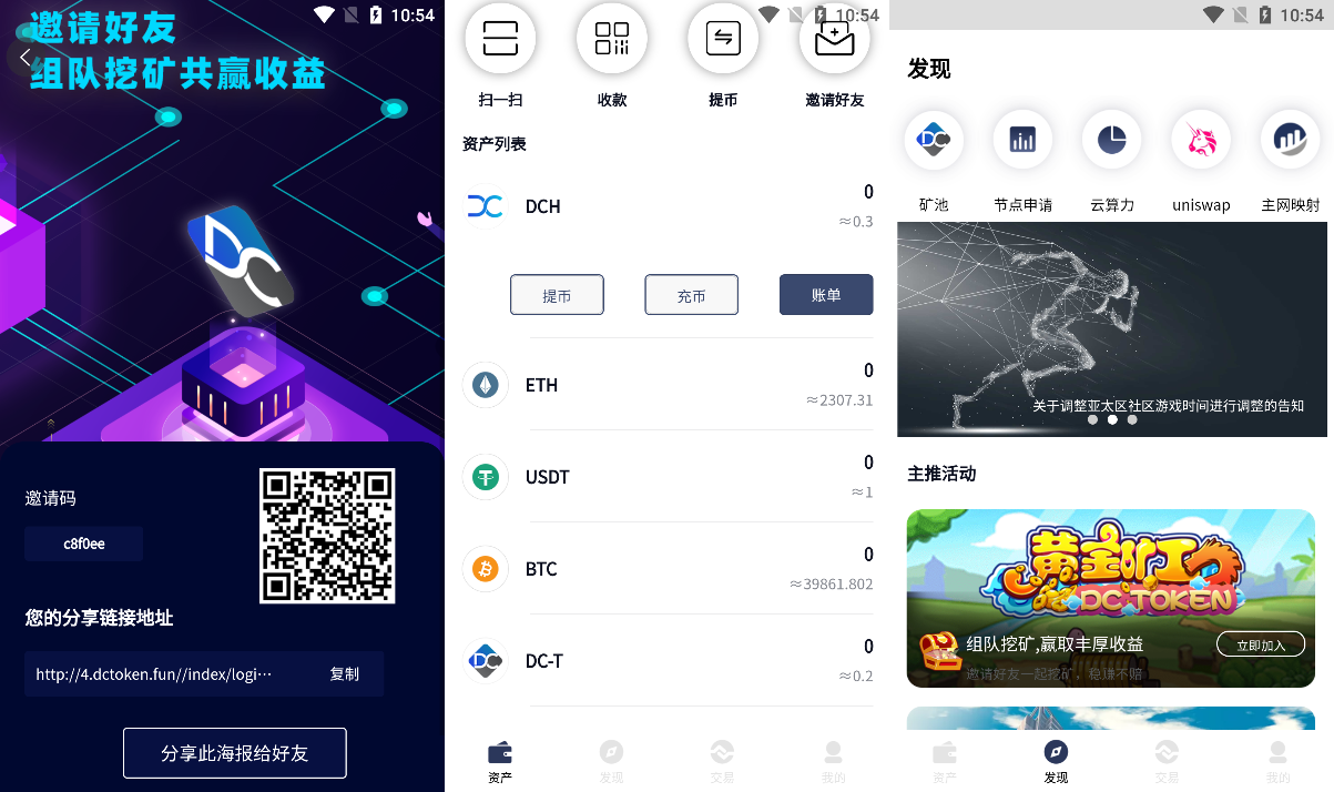 页面包含个人的分享邀请好友、矿池、币币交易、拼团游戏,等功能。
